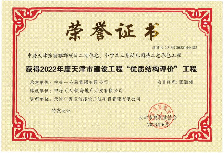 “優(yōu)質(zhì)結(jié)構(gòu)評價”工程是天津市建設(shè)工程結(jié)構(gòu)質(zhì)量的最高榮譽獎,獲此獎項表明東麗雅郡項目二期在工程質(zhì)量、安全生產(chǎn)、現(xiàn)場文明施工和施工管理等方面均達到先進水平。